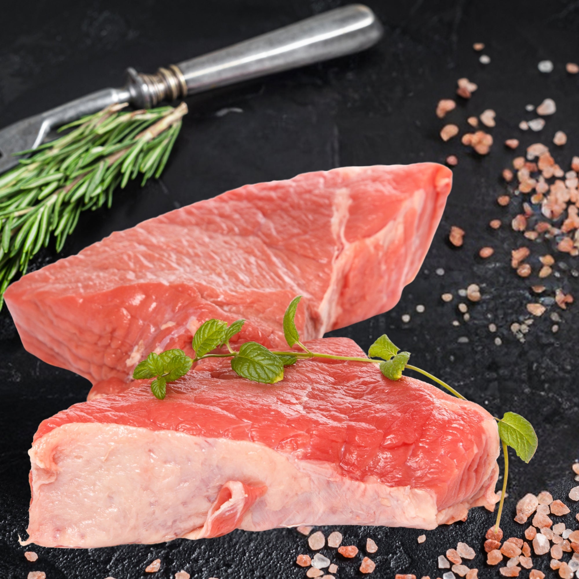 Outside round steak is a lean cut from the hindquarters, known for its firmness and flavor. It is best when marinated and slow-cooked or braised.