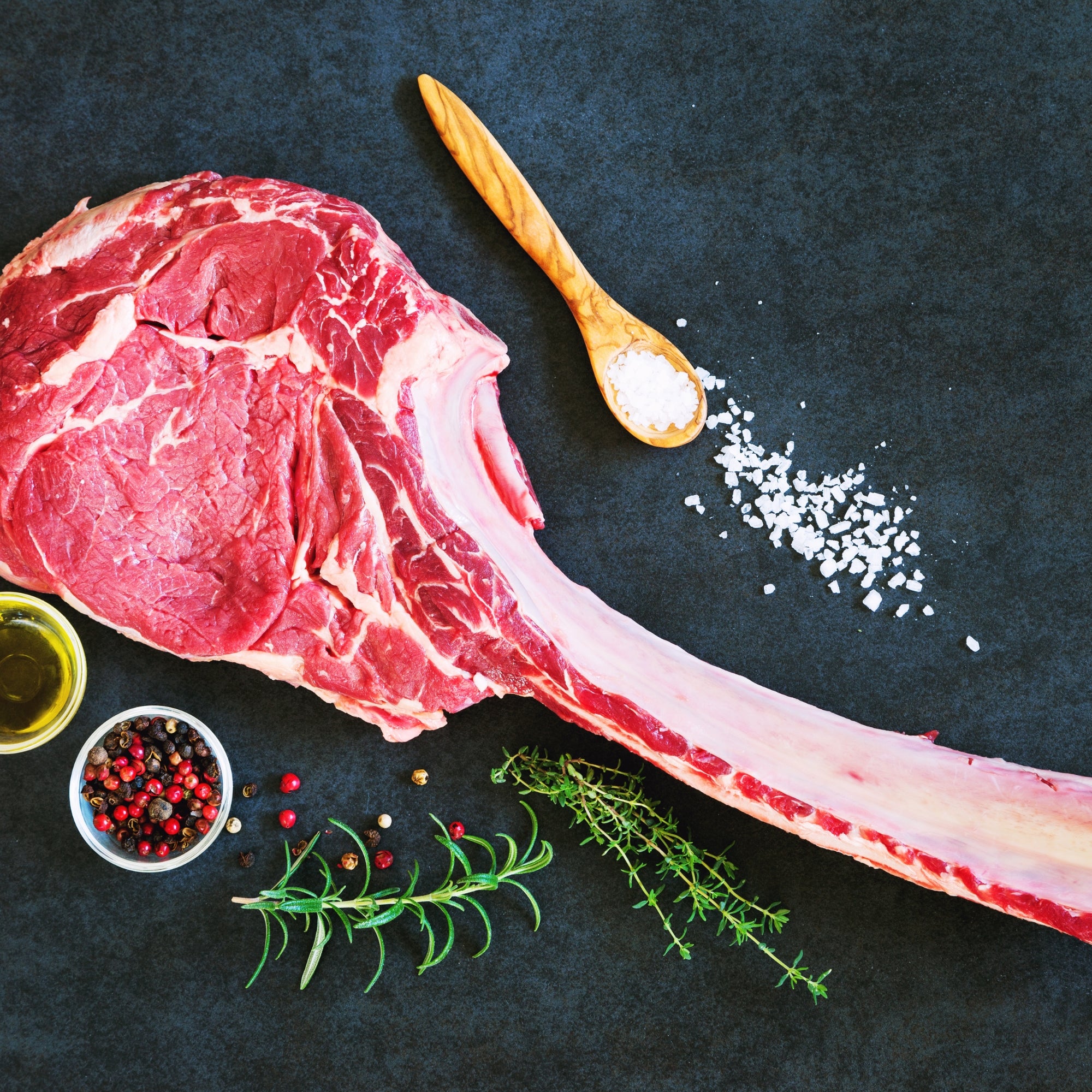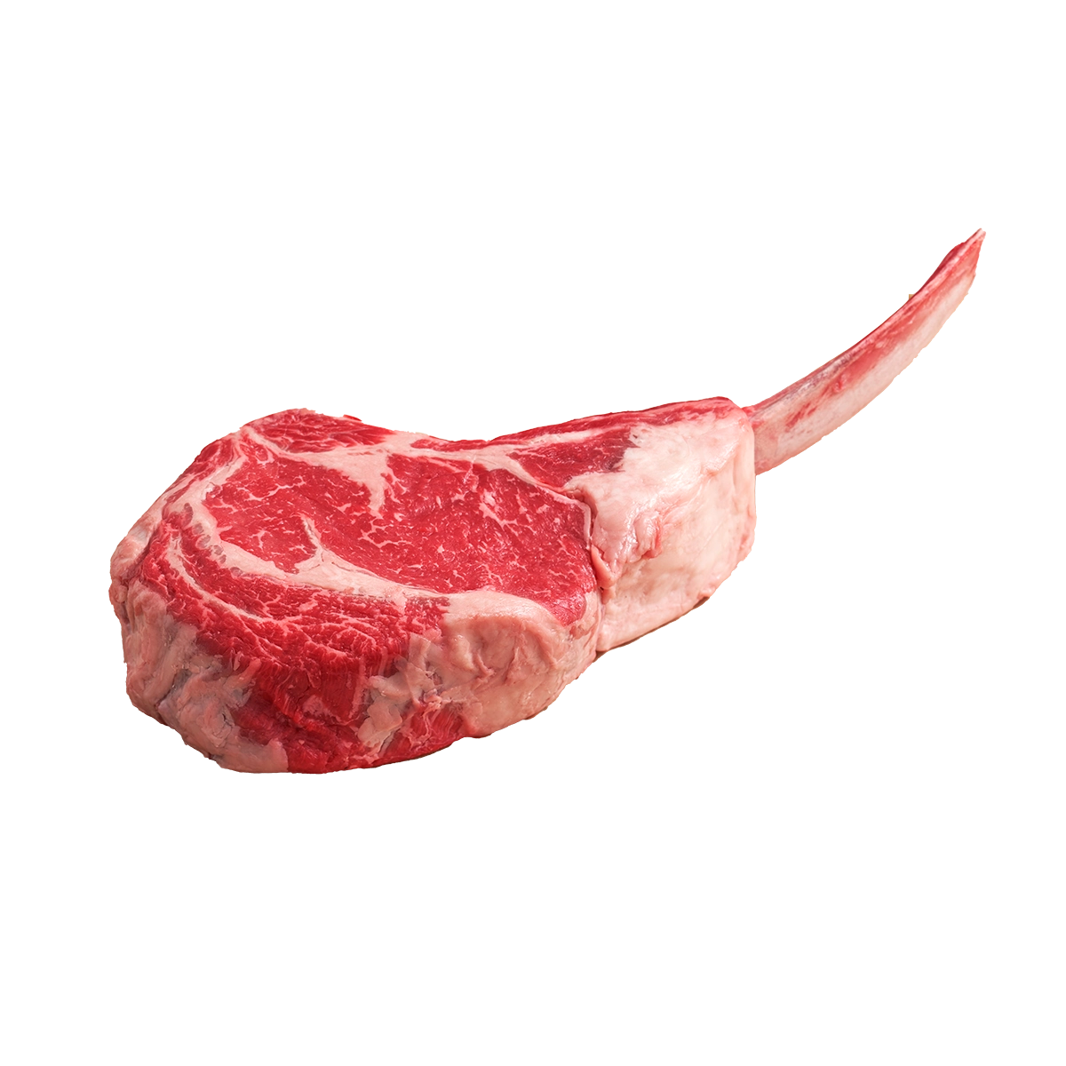 A tomahawk steak is a bone-in ribeye steak skillfully shaped to resemble a tomahawk, carved from the beef rib. This unique cut includes the eye of ribeye, the ribeye cap, and the complexus. What sets it apart is the intact, trimmed long bone, giving it a distinctive "Frenched" appearance and a handle-like structure reminiscent of a tomahawk axe. When the handle is omitted, it's often known as a cowboy steak. Typically weighing around 1.5 pounds with a thickness of about 3 inches, though occasionally reaching up to 2 pounds, the tomahawk steak is renowned for its intense flavor. Best enjoyed through high-heat cooking methods, it brings out its natural richness. Properly cooked, it offers a sumptuous flavor and a tender texture. Whether grilled, pan-seared, broiled, or roasted, this steak excels in various cooking techniques. The recommended internal temperature for optimum doneness is 145¶øF.